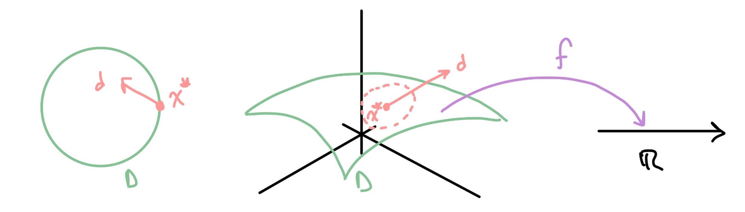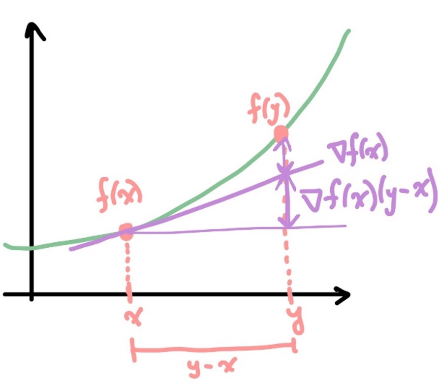 - We usually assume \(f\) is differentiable, specifically Fréchet or Gâteaux differentiable. Nevertheless, we denote gradient (or derivative) of \(f\) by \(\nabla f\):