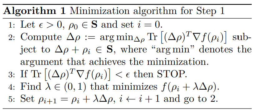 The notation is a little different, the differences are: their set \(S\) is my set \(E\), \(f(\rho) = S(\G(\rho)||\Z(\G(\rho)))\). Line 2 is simply the semidefinite program